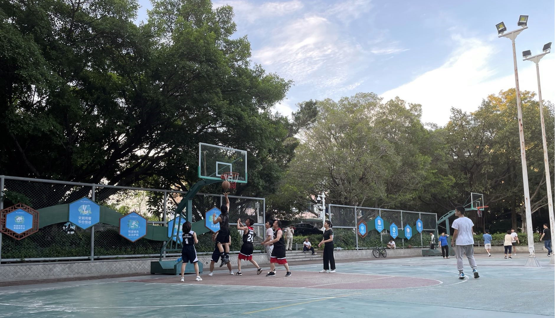 伴隨著哨聲的響起,現(xiàn)場的氣氛極具攀升,各隊員很快進入激烈角逐的狀態(tài),場下的啦啦隊為他們吶喊助威!女隊員給男隊員攔人,男隊員負責帥氣的進攻上籃得分,每個人都雄姿英發(fā),開啟暴走模式,你爭我奪,你攻我守。比賽越是進行到尾聲越是精彩,巧妙的傳球、華麗的轉身、經典的跳投,再加上解說員的渲染解說,更加精彩無比了。