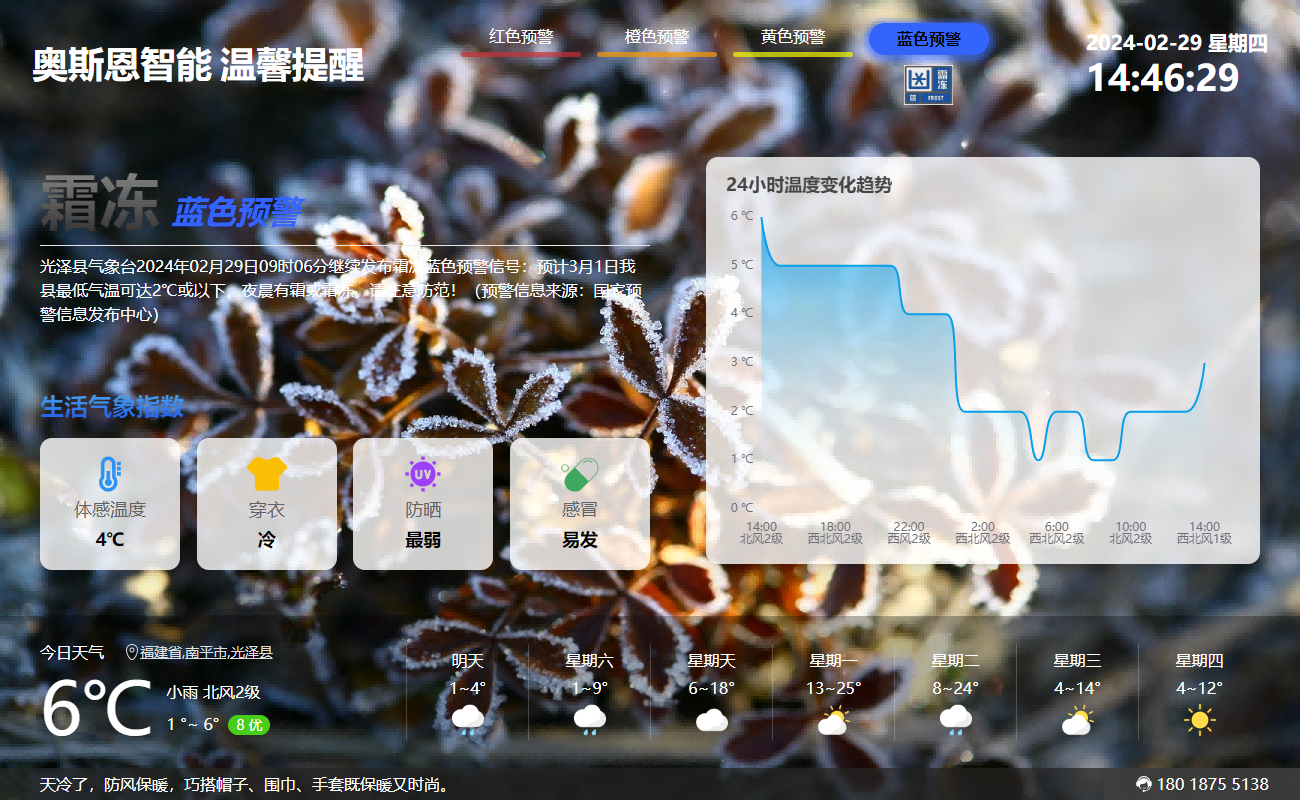 可獲取設(shè)備安裝點(diǎn)區(qū)域?qū)崟r(shí)天氣預(yù)報(bào)同步到LED屏幕上顯示 ,在向游客展示實(shí)時(shí)監(jiān)測(cè)數(shù)據(jù)信息時(shí),同步展示天氣預(yù)報(bào)預(yù)警。
